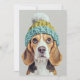 Cet adorable beagle est tout prêt pour l'hiver avec son mignon casquette tricoté dans les tons vert et bleu, surmonté d'un pom-pom moelleux. Les yeux expressifs et les oreilles disquettes du chien le rendent encore plus attachant et prêt pour la saison froide.