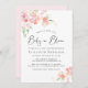 Cette jolie et élégante invitation au baby shower présente des flores d'aquarelle impressionnistes en rose et corail avec des accents d'or et "Baby in Bloom" écrit dans un script contemporain élégant.