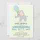 Beau éléphant à ballons bleu pastel, vert et jaune ; invitation baby shower garçon. Personnalisez cette douce et rétro sensation d'invitation; peut être pour le baby shower ou peut être changé à l'aspersion de bébé. Joli, simple, design sobre. Comprend l'éléphant, le ruban et les coeurs bleu oeuf robins, la police marron et l'arrière - plan blanc off. Idéal pour les animaux de la jungle, les animaux du zoo, les baby showers à thème ou les safaris !