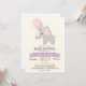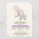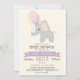 Beau éléphant à ballons rose pastel, violet et jaune; invitation baby shower fille. Personnalisez cette douce et rétro sensation d'invitation; peut être pour le baby shower fille ou peut être changé à l'aspersion de bébé. Joli, simple, design sobre. Comprend l'éléphant, lavande, ruban violet et les coeurs, police marron, et de l'arrière - plan blanc. Idéal pour les animaux de la jungle, les animaux du zoo, les baby showers à thème ou les safaris !