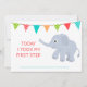 Le Bunting Drapeau Coloré et un bébé éléphant apprennent à se tenir debout est l'arrière - plan de cette carte de jalon pour bébé. Cette carte dit "Aujourd'hui j'ai pris ma première étape" mais les mots peuvent être changés. Vous pouvez entrer la date de l'événement jalon sur la carte