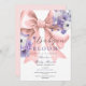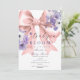 Baby In Bloom - Invitation Baby shower Célébrez l'arrivée prochaine de votre petit paquet de joie avec cette invitation baby shower charmant et sucrée "Baby In Bloom". Doté d'un arc de style coquette rose doux et délicat, orné de fleurs blanches et violettes, ce design est parfait pour une fête douce et féminine.