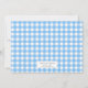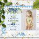 Bleu bleu doux et estival thème pique-nique invitation pour la fête d'anniversaire de petite fille. Doté d'une belle aquarelle bleutée et de fleurs, une section modèle photo pour vous d'ajouter sa photo et avec une table de pique-nique classique bleu et blanc à carreaux "couverture" au verso.