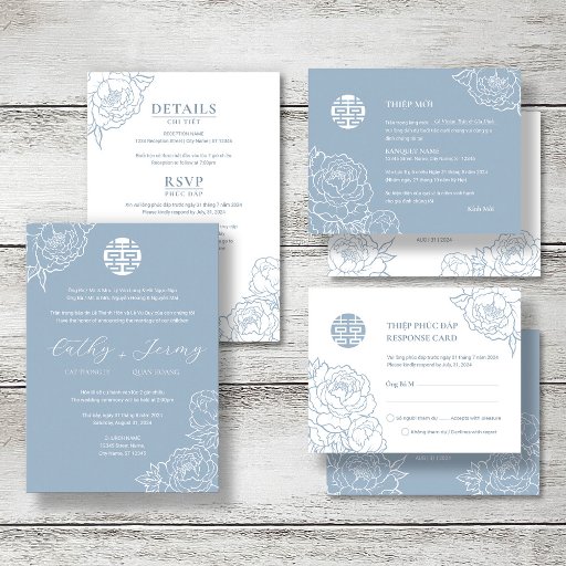Invitation Bilingue Vietnamienne Peony Chanson Hy Dusty Blue