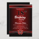 Une invitation à la fête du 18e anniversaire rouge et noir avec un texte blanc et un ruban rouge et blanc et un arc. Remplacez les détails de cette invitation par les vôtres pour créer l'invitation parfaite de fête d'anniversaire pour votre événement.