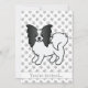 Illustration originale de Destei d'un chien de race Papillon en noir et blanc vêtu. L'arrière - plan a un motif d'empreintes de pattes de chien gris. Sur le devant, on peut lire "Vous êtes invité..." et à l'arrière, il y a des zones de texte personnalisables pour les détails de l'événement.