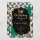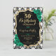 Elégante invitation à 50e anniversaire fleurie avec votre photo au verso de la carte. Glam vert émeraude design avec de l'or de parties scintillant imitation. Caractéristiques noir et blanc motif damassé, roses verts, police de script et confetti. Parfait pour une fête anniversaire adulte élégante. Personnalisez avec vos propres détails. Peut être customisé pour n'importe quel âge ! Invitations Zazzle imprimées ou téléchargement instantané modèle imprimable numérique.