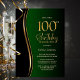 Invitation vos amis et ceux qui vous sont chers avec cette invitation moderne de fête du 100e anniversaire en noir, or et vert. La zone de texte personnalisable de ce modèle d'invitation vous permet d'inclure sans effort tous les détails nécessaires à votre fête d'anniversaire, y compris la date, l'heure, le lieu et les informations RSVP. Une variété de types de papier et de styles d'angle sont disponibles pour vos invitations uniques, ainsi que l'option de téléchargement si vous préférez un format numérique.