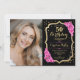 Elégante invitation à 50ème anniversaire fleurie avec votre photo. Design rose noir glam avec parties scintillant d'or faux. Comprend des roses roses roses, des caractères de script et des confettis. Parfait pour une fête anniversaire adulte élégante. Personnalisez avec vos propres détails. Peut être customisé pour n'importe quel âge ! Invitations Zazzle imprimées ou téléchargement instantané modèle imprimable numérique.