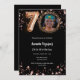 Une invitation photo moderne et design pour une fête de 70e anniversaire. Un arrière - plan noir classique, décoré d'étoiles dorées roses. Personnalisez et ajoutez les détails de votre fête.