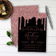 Rose Gold Sparkle Parties scintillant Drips Graduation Party Invitation avec des gouttes de fausse parties scintillant et un arrière - plan noir chic. Conçu par Cèdre et String. Pour personnaliser davantage, cliquez sur le lien "customiser plus loin" et utilisez l'outil de conception pour modifier la conception. Si vous avez besoin d'aide ou d'articles correspondants, veuillez nous contacter à cedarandstring@gmail.com .