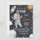 Black Space First Trip Autour du Soleil 1er Anniversaire Invitation de premier anniversaire du mignon garçon sur le thème de l'espace extra-atmosphérique avec un vaisseau spatial, diverses étoiles, planète et soleil ainsi qu'un astronaute avec une photo à l'intérieur du casque spatial. Ce premier voyage autour de l'invitation d'anniversaire du soleil est une façon mignonne pour les invités invitations à une fête d'anniversaire sur le thème de l'espace extra-atmosphérique.