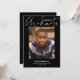 Ce carte photo minimaliste de graduation présente un design simple avec un script informel. Sur le devant, "Graduate" est écrit en calligraphie décontractée sur le dessus, avec une grande photo ci-dessous. En bas, ajoutez le nom, l'école et l'année de diplôme du diplômé. La typographie est blanche contre un arrière - plan noir épais. Le verso de la carte de graduation comprend un modèle optionnel pour ajouter les détails de la fête de graduation.