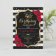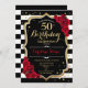 Invitation du 50e anniversaire. Elégant design noir blanc rouge avec fausse parties scintillant. Bandes noires et blanches avec roses rouges. Parfait pour une soirée d'anniversaire élégante.