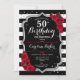 Elégante invitation à 50e anniversaire fleurie avec votre photo au verso de la carte. Noir noir blanc rouge design avec fausse parties scintillant argent. Caractéristiques noir et blanc rayures, roses rouges, police de script et confetti. Parfait pour une fête anniversaire adulte élégante. Personnalisez avec vos propres détails. Peut être customisé pour n'importe quel âge ! Invitations Zazzle imprimées ou téléchargement instantané modèle imprimable numérique.