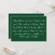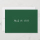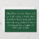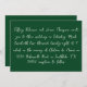 Les détails du mariage sont listés dans un style manuscrit, texte blanc. L'arrière de l'invitation est un vert de forêt solide avec du texte blanc pour la date.
