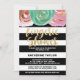 Cette carte d'invitation en lingerie à rayures noires et blanches et en or est parfaite pour une élégante douche à thème. Le design classique à rayures noires est décoré de grandes fleurs à la menthe et aux fleurs roses et d'une police en écriture de parties scintillant d'or. Le fond est orné d'un coeur doré et des initiales de la mariée et du marié. Remarque : Ce design ne comporte pas de véritable parties scintillant en or. C'est un graphisme de haute qualité fait pour ressembler à l'or pétillant.