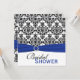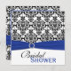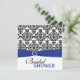 Cette invitation nuptiale de douche de damassé noire et blanche moderne avec un ruban et une broche ornée de bijoux de FAUX de bleu royal assortit les invitations de mariage montrées ci-dessous. Tout le texte est personnalisable et ainsi est le choix de papier. S'il y a des autres articles que vous devez rendre votre événement extra spécial, envoyez svp votre demande à niteowlstudio@gmail.com. Si vous voulez cette invitation dans une autre combinaison de couleurs, envoyez la demande à l'adresse ci-dessus.