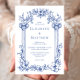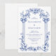 Cette faire-part de mariage d'inspiration vintage est encadrée de colonnes classiques et de motifs floraux en bleu sur un arrière - plan blanc. Les noms du couple apparaissent dans la police serif classique, avec le reste du texte en italique.