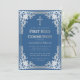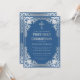 Cette élégante invitation de première communion bleue et argentée avec une atmosphère vintage, recommandée pour un garçon, comporte un cadre en faux foil argenté orné de décorations baroques argentées élégantes sur un fond bleu classique. Au-dessus du texte, il y a une croix religieuse en faux foil argenté. Sauf pour l'occasion "Première Sainte Communion", qui est également en faux argent, tout le texte peut être personnalisé et a une couleur gris argenté similaire au cadre en faux argent.