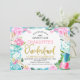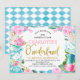 Blue Diamond Floral Alice In Oderland Anniversaire Invitation Sweet Alice Dans onederland invitation d'anniversaire mettant en vedette divers articles de l'histoire sur un arrière - plan de diamant bleu. Cette invitation d'anniversaire Alice au pays des merveilles comporte également une fausse image texte en feuille d'or qui est amovible.