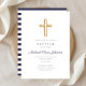 Invitation Bleu marine Script Croix religieuse garçon Baptême