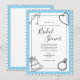 Amusant design moderne noir & blanc invitation à la douche nuptiale avec des graphismes mariages dessinés à la main dans chaque coin. Couleur accent bleu. Parfaitement encadré avec un bord de pétoncle blanc avec contour noir. La coordination des polices ajoute à la beauté de ce design.