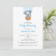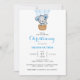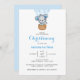 Doux bébé bleu Christening invitation avec mignon ours bleu dans une montgolfière bleue.
