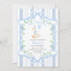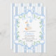 Our elegant "Blue Bow One Silly Goose Floral Boy 1st Birthday invitation" features a watercolor illustration of a white goose wearing a party hat and adorned with a blue bow, holding a blue balloon. The goose is framed by a decorative blue ribbon embellished with green floral motifs. The background is striped in white and blue.
