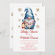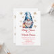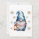 A whimsical watercolor illustration of a Christmas gnome in a blue and white winter theme. The gnome wears a tall pointed hat with a blue and white gradient pattern and small white snowflakes. The hat has a pointed tip and a curved brim. The gnome has a large round pink nose, a long white beard, and is decorated with a string of red berries across its chest. The gnome is holding a glowing red lantern with a warm yellow light inside. The background features golden snowflake patterns scattered around the gnome. The snowflakes are detailed with intricate star patterns and vary in size. The gnome's body is painted in a blue and white watercolor style with subtle texture and shading. The overall illustration has a soft, painterly quality with white space around the elements. The composition is centered with the snowflakes creating a festive border around the gnome.
