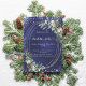 A navy blue, uneven colored background decorated with cones, white berries and greenry. A faux silver oval frame and glitter. Personalize and add the details.