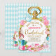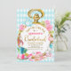 Blue Diamond Watch Alice In Onederland Anniversaire Invitation Cute Alice au pays des merveilles sur le thème de l'invitation de premier anniversaire pour une petite fille avec une grande montre de lapin blanc, diverses arrangements floraux roses, lapin blanc, un casquette de haine, théière et divers autres articles de l'histoire. Le design comprend également un mot de feuille d'or immobile dans un style calligraphique mignon et un arrière - plan motif en forme de losange bleu bébé.