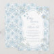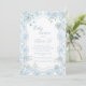Beautiful blue watercolor fancy frame surrounding lovely fonts and scripts done in coordinating colors baby shower invite. A blue and white sweet coordinated floral background with soft blue flower accents with delicate green leaves. A perfect baby shower invitation for any season.