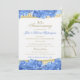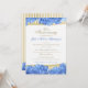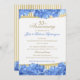 Elégantes rayures dorées décorées de belles hydrangées bleues florales et texte de script élégant invitation 50e anniversaire. Il suffit de le customiser pour modifier les styles de texte et de police.