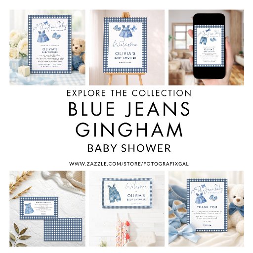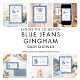 Blue Jean Denim Boy Gingham Baby Shower. Available digitally and printed. Celebrate the mom-to-be with this sweet design with a blue denim baby clothes theme and gingham background.. A Blue Jean Baby is in a set modern script. Easily personalise the rest of the words as required.