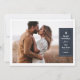This rustic Christmas card features a large photo with a white border frame. On the right side of the card, there is a blue, vintage-inspired label with the holiday greeting and space for the customer's name. There is a small pine tree illustration on top of the label, as well as a subtle woodgrain texture in the background. The back of the card features a coordinating, all over pine tree pattern.