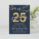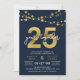 Invitation pour une soirée élégante de 25e anniversaire avec des guirlandes lumineuses et "25" en or faux avec "ans ensemble" en blanc sur fond bleu foncé. La carte comprend un verso avec un motif assorti. Découvrez les articles assortis comme les autocollants et les tampons ici https://www.zazzle.com/collections/strings_of_lights_faux_gold_celebration_collection-119311942951401241?rf=238364477188679314