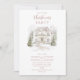 An elegant holiday invitation featuring a hand-painted blush manor adorned with evergreen garlands and winter trees. The soft pastel tones and refined architecture evoke timeless charm and warmth — perfect for hosting a sophisticated Christmas party or festive family gathering in style.