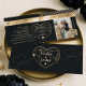 Take your guests on a journey before your big day with our black and gold Save the Date photo boarding pass plane ticket, designed with elegant faux gold accents for a refined, luxury look. This striking design features a dramatic black background paired with sophisticated faux gold details, where your event information is beautifully arranged in authentic boarding pass style alongside our signature heart-shaped word map design, personalized with your names. Add your photo for a personal touch, along with a scannable QR code for easy RSVPs or additional wedding details. The reverse side continues the cohesive aesthetic, showcasing the heart-shaped word map and your names, creating a memorable keepsake your guests will treasure. Perfect for couples planning a travel-themed or destination wedding, this design blends modern elegance, personalization, and wanderlust-inspired charm—making a lasting impression from the moment it arrives. Design and illustration by ©Moodthology Papery