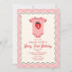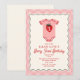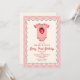 Fraise d'anniversaire "baies d'abord" avec illustration du maillot de bébé avec fraise. La bordure est ondulée avec le design en damier rose.