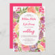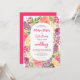 Faire-part de mariage chic en arche fleurie et bohème, joli peint à la main, fleurs sauvages vives et audacieuses, mêlent une atmosphère vintage, avec des pivoines de corail, des fleurs violettes, des roses roses et de la verdure, avec une fête de mariage botanique sur le thème du boho. Avec une typographie de script moderne et rose néon.