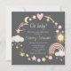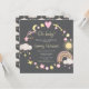 Cette invitation au baby shower mignonne et fantaisiste présente un arc-en-ciel, des nuages, du soleil, une lune et des étoiles en rose et jaune sur un arrière - plan gris foncé. Le texte combine écriture manuscrite et polices sans serif pour un look élégant et moderne. C'est parfait pour un baby shower à thème météo.