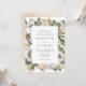 Elégante et unique faire-part de mariage à fleurs blanches, avec des détails mariages encadrés de fleurs d'aquarelle blanche et de feuillage luxuriant dans des tons riches de terre verte, beige et marron. L'invitation revient à un arrière - plan d'aquarelle beige clair.