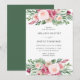 Invités Invitations à votre mariage dans le style avec nos élégantes invitations à mariage à la pêche, à l'aquarelle rose et bleu. L'invitation affiche vos détails mariages avec des vaporisateurs de pêche, de bleu et de fleurs d'aquarelle rose en haut et en bas. Personnalisez les invitations en ajoutant votre nom, votre date de mariage, votre heure, votre emplacement et les informations de réception. L'invitation revient à un arrière - plan vert solide ou à la couleur de votre choix. Parfait pour les mariages de printemps et d'été !