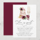 Invitez les invités à la fête prénuptiale avec style avec nos invitations de mariage Boho Bourgogne & Floral Blush. L'invitation de mariage chic présente un gâteau à étages aquarelle avec des fleurs de bourgogne et de rose blush, un candélabre et des verres à vin de bourgogne. La phrase "L'amour est doux" est affichée dans un script de calligraphie moderne avec les détails de votre fête prénuptiale ci-dessous. L'invitation de mariage florale se retourne sur un fond de bourgogne uni.