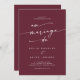 Ce chic boho rouge bordeaux code QR français faire-part de mariage est parfait pour un mariage minimaliste. Le vin de marron foncé rouge design bohème moderne dispose de calligraphie rustique simple avec un style unique mais classique. Ajoutez un code QR au dos de votre invitation de mariage pour que vous puissiez facilement vous inscrire à RSVP, voir les détails ou les deux.
