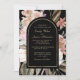 Elégante faire-part de mariage de style boho avec de jolis roses d'aquarelle rose vif et une variété d'autres fleurs et verdure sur un arrière - plan noir.