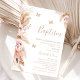 Boho rose Floral et papillons Baptême Invitation Ce baptême ou cette invitation à baptiser douce présente des tons roses, rousses et naturels bohème arrangements floraux et trois faux papillons parties scintillant en or rose.