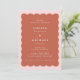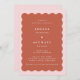 Une faire-part de mariage moderne et élégante avec une forme de pétoncle ondulé en terre cuite avec un bord rose vif avec une police blanche.
