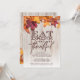 Invitation votre famille et vos amis à votre fête de Thanksgiving avec cette carte rustique. Cette carte présente un design typographique "Eat Drink and be Thankful" sur arrière - plan de bois rustique avec des feuilles d'automne au sommet.